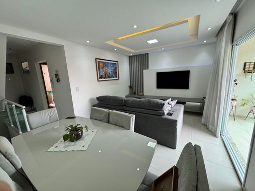 Linda Casa assobradada com 3 dorms sendo 1 suíte, 2 dorms com ar condicionado, sala ampla de estar, cozinha com planejados, área de serviços, espaço gourmet com churrasqueira, 8 vagas. Estuda permuta por apto, terreno, veículos.