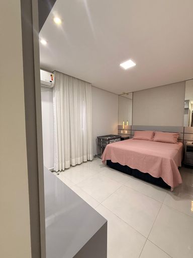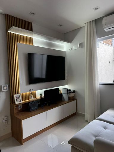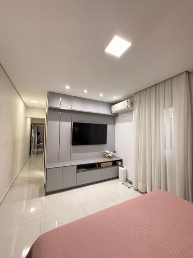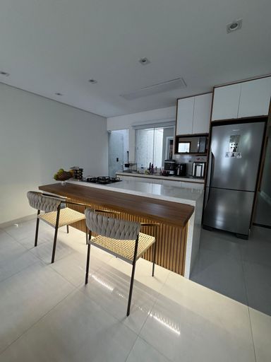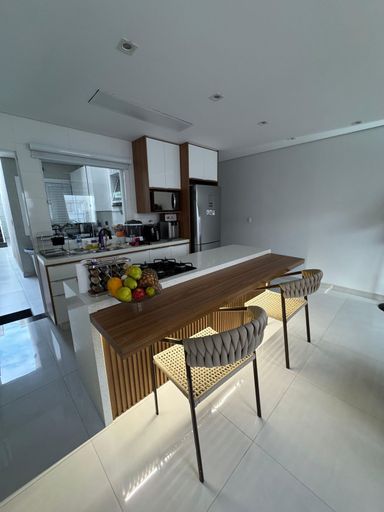 Com Jacuzzi para 8 pessoas, ar condicionado na suite e espaço gourmet, cozinha com planejados e ilha com detalhes em madeira ripada e pedra branca estellar.